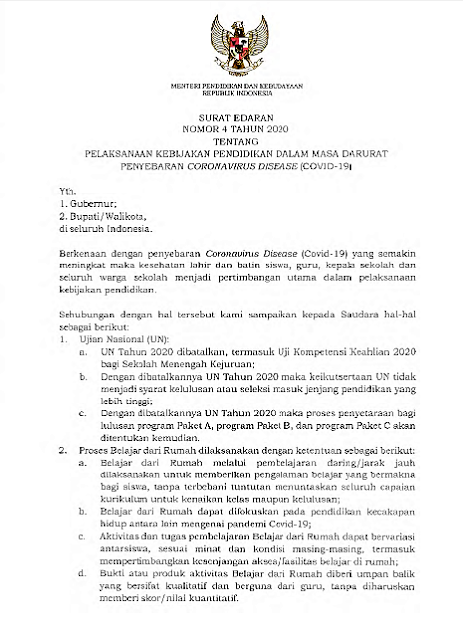 Keputusan pembatalan UN ini tertuang dalam Surat Edaran Menteri Pendidikan dan Kebudayaan (Mendikbud) Nomor 4 Tahun 2020, tentang pelaksanaan kebijakan pendidikan dalam masa darurat penyebaran corona virus disease (Covid-19).