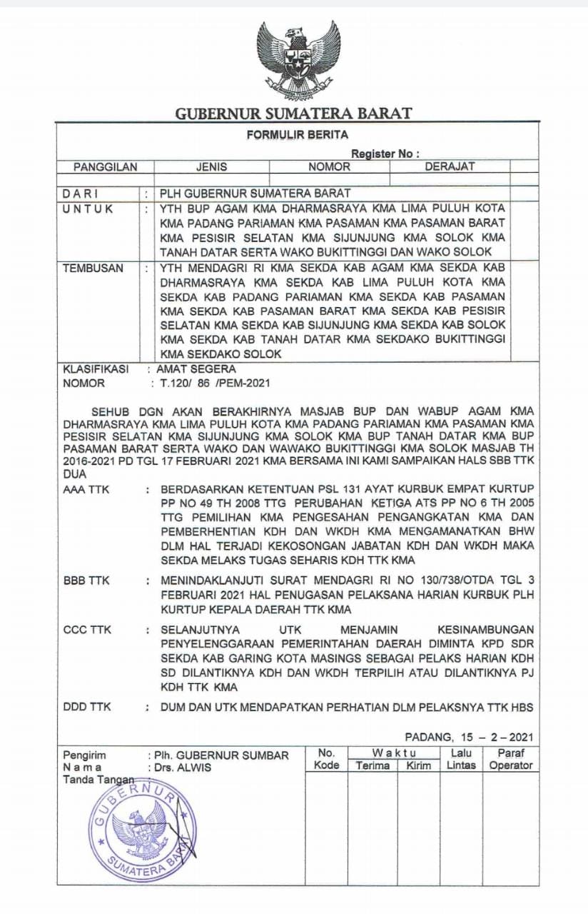 Plh Gubernur Sumatera Barat Drs.Alwis dalam Formulir Berita yang diklasifikasikan “Amat Segera” itu menyampaikan; Sehubungan dengan berakhirnya Masa jabatan Bupati dan Wakil Bupati serta Walikota dan Wakil Walikota (2016 – 2021) tersebut pada tanggal 17 Februari 2021, maka berdasarkan ketentuan Undang-Undang Pasal 131 (4) PP NO 49 Tahun 2008 tentang perubahan ketiga atas PP NO 6 Tahun 2005 tentang pemilihan, pengesahan dan pengangkatan, dan pemberhentian Kepala Daerah dan Wakil Kepala Daerah maka Sekretaris Daerah melaksanakan tugas Harian Kepala Daerah menindaklanjuti Surat MENDAGRI RI NO. 138/738/OTDA  tanggal 3 Februari 2021 perihal pelaksanaan Tugas Harian (PLH) Kepala Daerah.