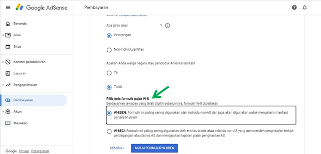 - Pilih W-8BEN untuk menampilkan formulir untuk pengajuan info pajak bagi individu di luar Amerika Serikat. Untuk melanjutkan klik tombol MULAI FORMULIR W-8BEN.