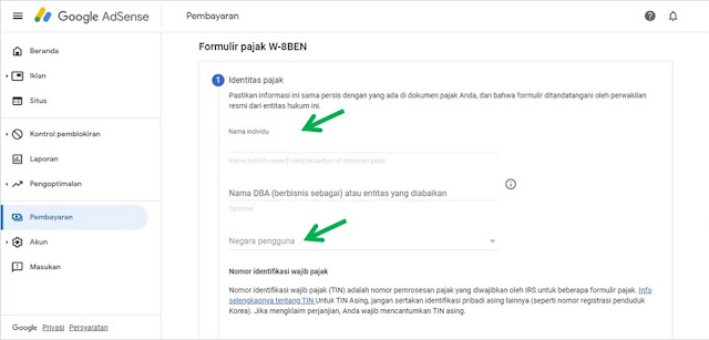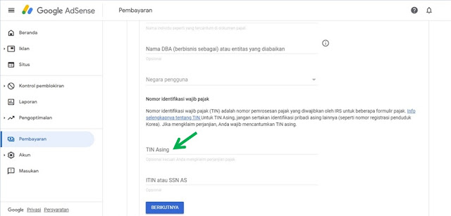- Isi nama individu sesuai nama Anda yang digunakan pada akun Google Adsense. Kemudian isi Negara Pengguna dengan Indonesia. Lalu isi TIN Asing dengan Nomor Pokok Wajib Pajak (NPWP) Anda. Klik BERIKUTNYA untuk langkah selanjutnya.