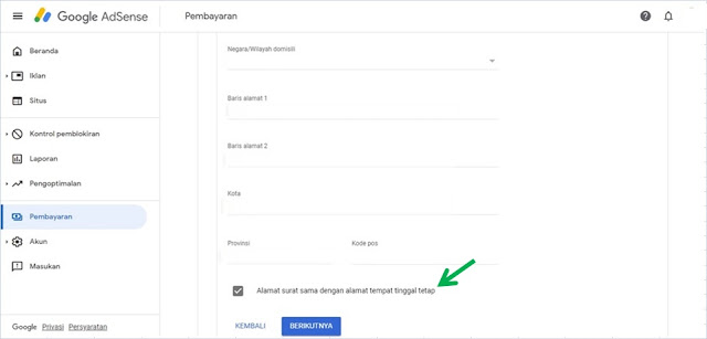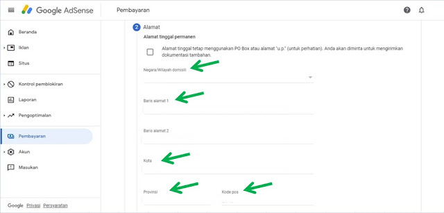 - Isi alamat lengkap Anda sesuai alamat yang Anda gunakan pada akun Google Adsense Anda. Jangan lupa juga mengisi Kode Pos.