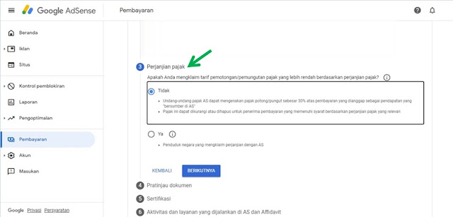 - Berkaitan pengajuan info pajak sebagai mitra di luar Amerika Serikat, klik pilihan Tidak. Klik BERIKUTNYA untuk langkah selanjutnya.