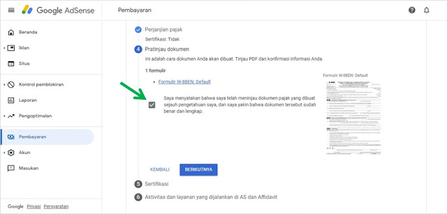 - Centang pilihan yang ada di Pratinjau Dokumen tersebut untuk konfirmasi bahwa Anda yakin formulir yang telah Anda isi pada langkah sebelumnya sudah benar. Klik BERIKUTNYA untuk langkah selanjutnya.