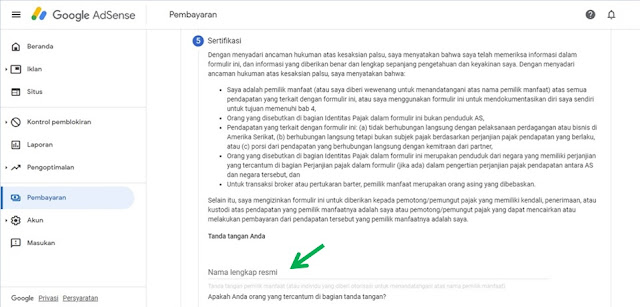 - Isikan poin Sertifikasi dengan nama lengkap resmi, sesuai dengan nama yang Anda gunakan pada akun Google Adsense.
