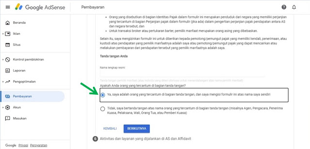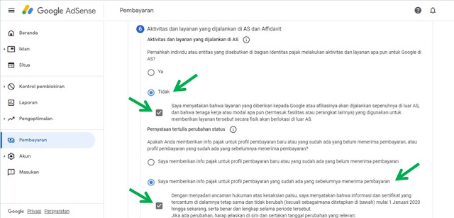 - Pilih tidak untuk menyatakan bahwa Anda tidak pernah melakukan aktivitas dan layanan apapun untuk Google di Amerika Serikat, dan centang pilihan di bawahnya untuk konfirmasi pernyataan. Lalu pilih ‘Saya memberikan info pajak untuk profil pembayaran yang sudah ada yang sebelumnya menerima pembayaran’. Pilihan tersebut jika Anda sudah pernah menerima pembayaran dari Adsense, dan centang pilihan di bawahnya untuk kekuatan hukum.