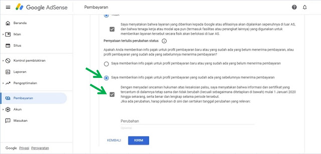 - Klik tombol KIRIM untuk pengajuan formulir info pajak yang sudah Anda isi ke pihak Adsense.