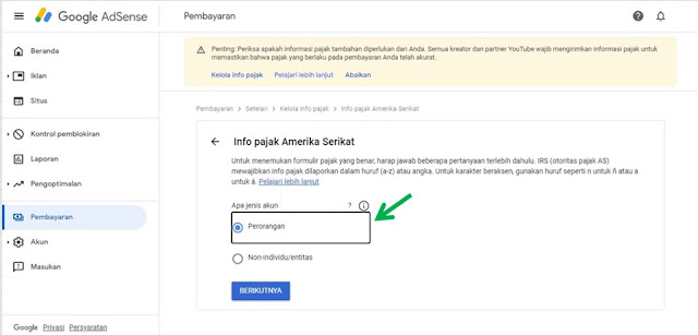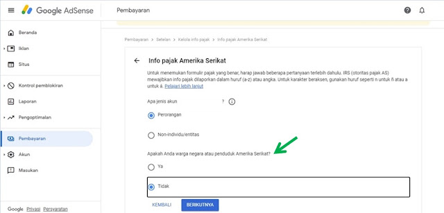 - Pada Info Pajak Amerika Serikat pilih Perorangan jika akun Google Adsense Anda dikelola secara individu, atau pilih Non-Individu/entitas jika dikelola oleh komunitas atau kelompok (organisasi). Klik BERIKUTNYA untuk langkah selanjutnya.