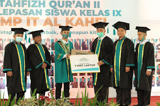 SMP IT Al Kahfi memberikan reward satu unit Laptop kepada masing-masing wisuda terbaik. Bupati Hamsuardi beserta pimpinan sekolah memberikan hadiah tersebut kepada siswa yang berprestasi dan terbanyak hafalan Qur’annya.