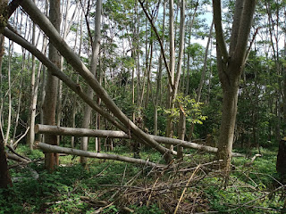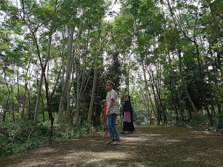 Sabtu pagi kami ke Hutan Kota dan Taman Satwa. Suasananya adem khas hutan tropis. Pohon-pohon ada yang tumbang. Barangkali sebab angin kencang beberapa hari lalu. Ada penunjuk arah Jalan Buaya, Jalan Beruang, Jalan Ular, Jalan Kancil. Ada tanaman perdu dan rumput. Kami menghirup napas dengan oksigen yang melimpah.