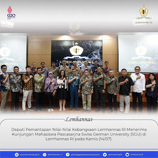 Jakarta, andalasrayanews.com.Sahabat Tannas, Deputi Pemantapan Nilai-Nilai Kebangsaan Lemhannas RI Laksda TNI Edi Sucipto, S.E., M.M., M.Tr. Opsla. yang didampingi oleh Tenaga Profesional Bidang Kepemimpinan Lemhannas RI Dr. Ir. Vita DD Soemarno, M.M. dan Kepala Biro Humas Settama Lemhannas RI Brigjen TNI Gathut Setyo Utomo, S.I.P., M.I.P. menerima kunjungan dari sejumlah mahasiswa pascasarjana Swiss German University (SGU) bertempat di Ruang Syailendra, Gedung Asta Gatra Lemhannas RI pada Kamis, 14 Juli 2022.