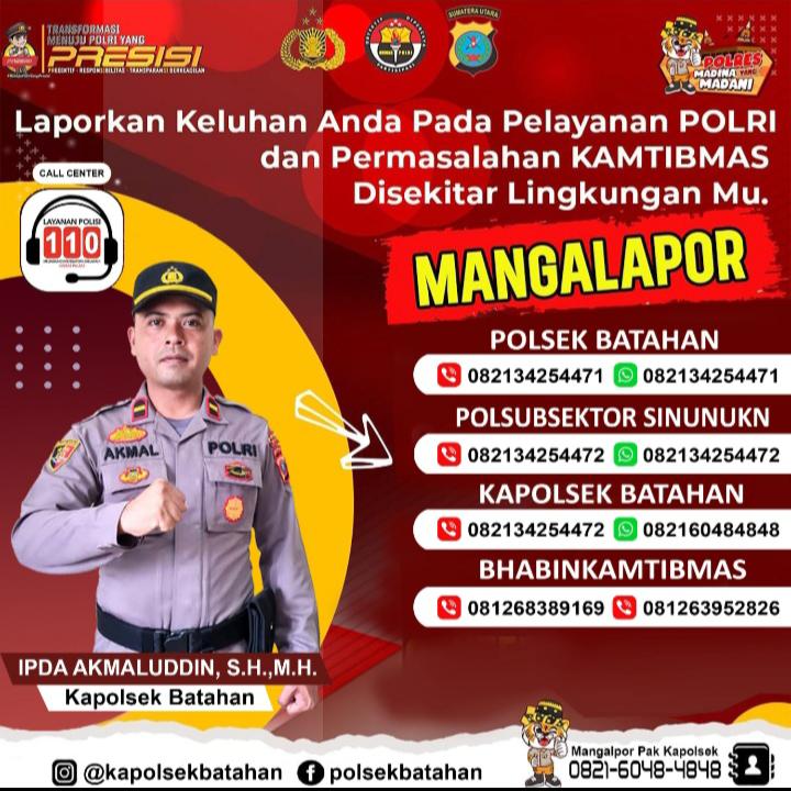 Sebagai seorang Polsek IPDA Akmaluddin,,S.H,M.H yang saat ini menjabat sebagai Plh.Polsek Batahan ia juga turut mendukung penuh program quick wins presisi ini dengan menajalan Program Mangalapor yang dibuat oleh kapolres Mandailing Natal.