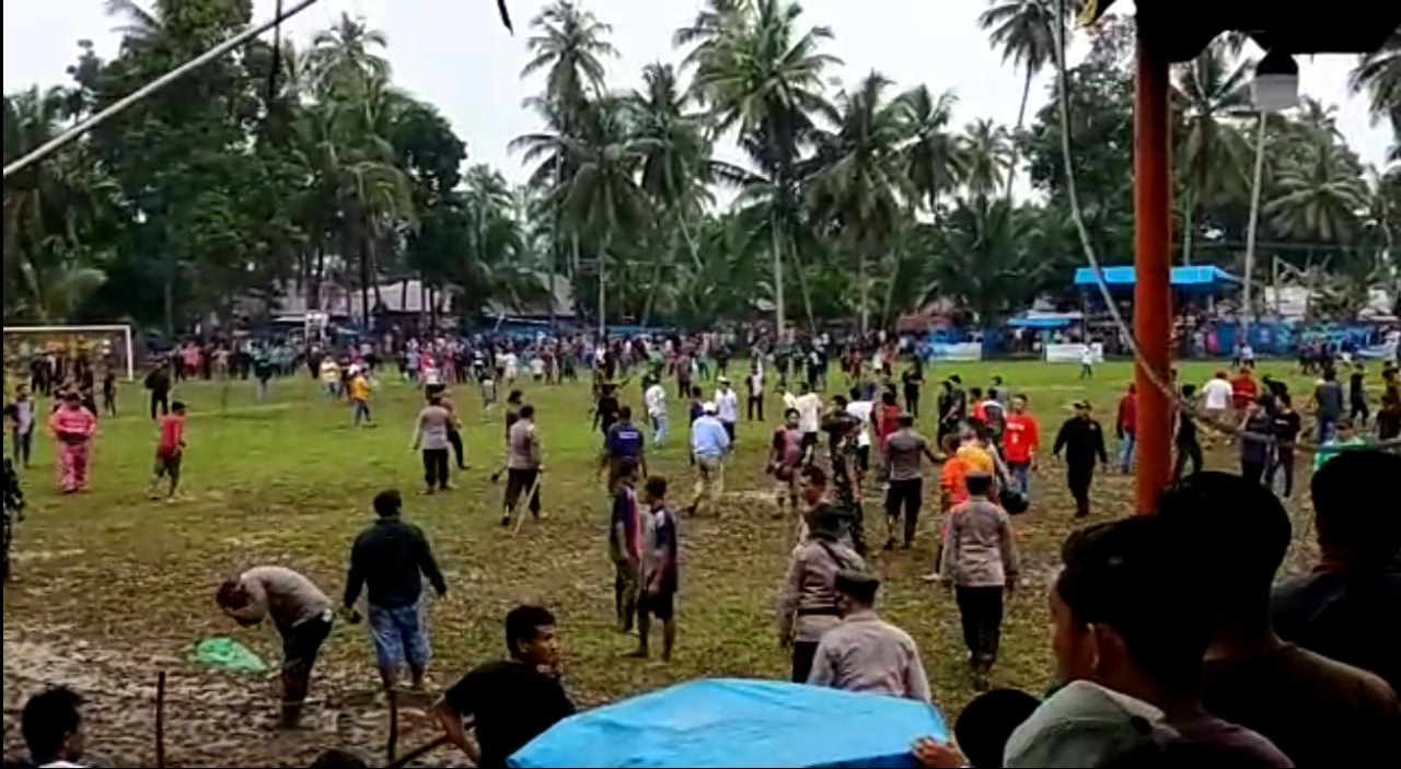 NATAL, Andalas Raya News-Final Turnamen Sepakbola BOPAS cup IV antara kesebelasan Nata FC VS PSM Pulo Padang dilapagan desa Bondakase,kecamatan Natal, Kabupaten Mandailing Natal berujung ricuh.Minggu,2/11/2022.