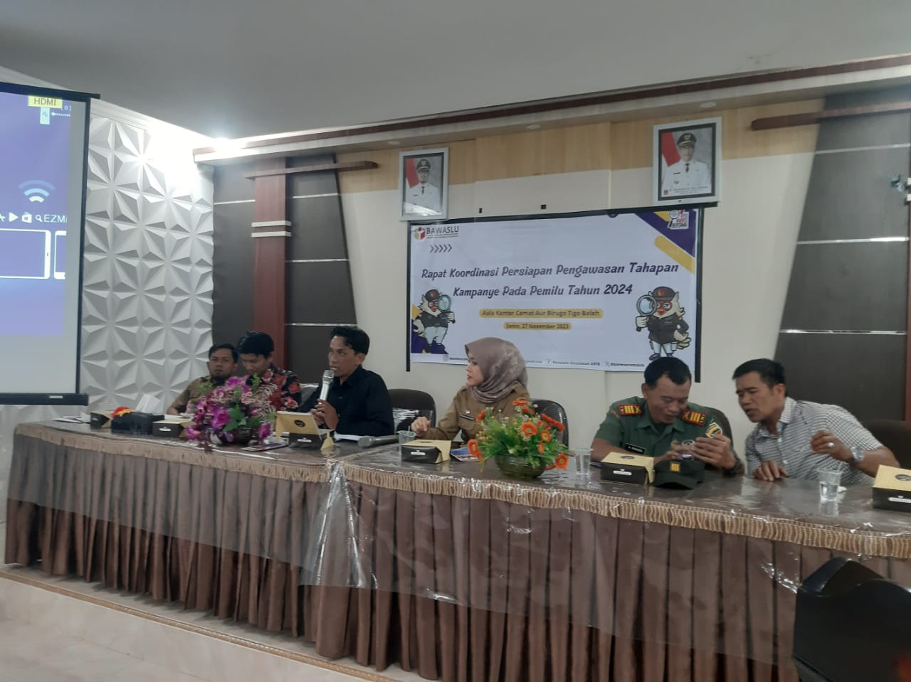Bukittinggi,Andalas Raya News | Panwascam Kecamatan Aur Birugo Tigo Baleh (ABTB) Kota Bukittinggi menggelar rapat Koordinasi dengan berbagai stakeholder yang berkaitan dengan pelaksanan pengawasan kampanye. Rapat koordinasi ini dilaksanakan di Aula Kantor Camat ABTB, Senin (27/11).
