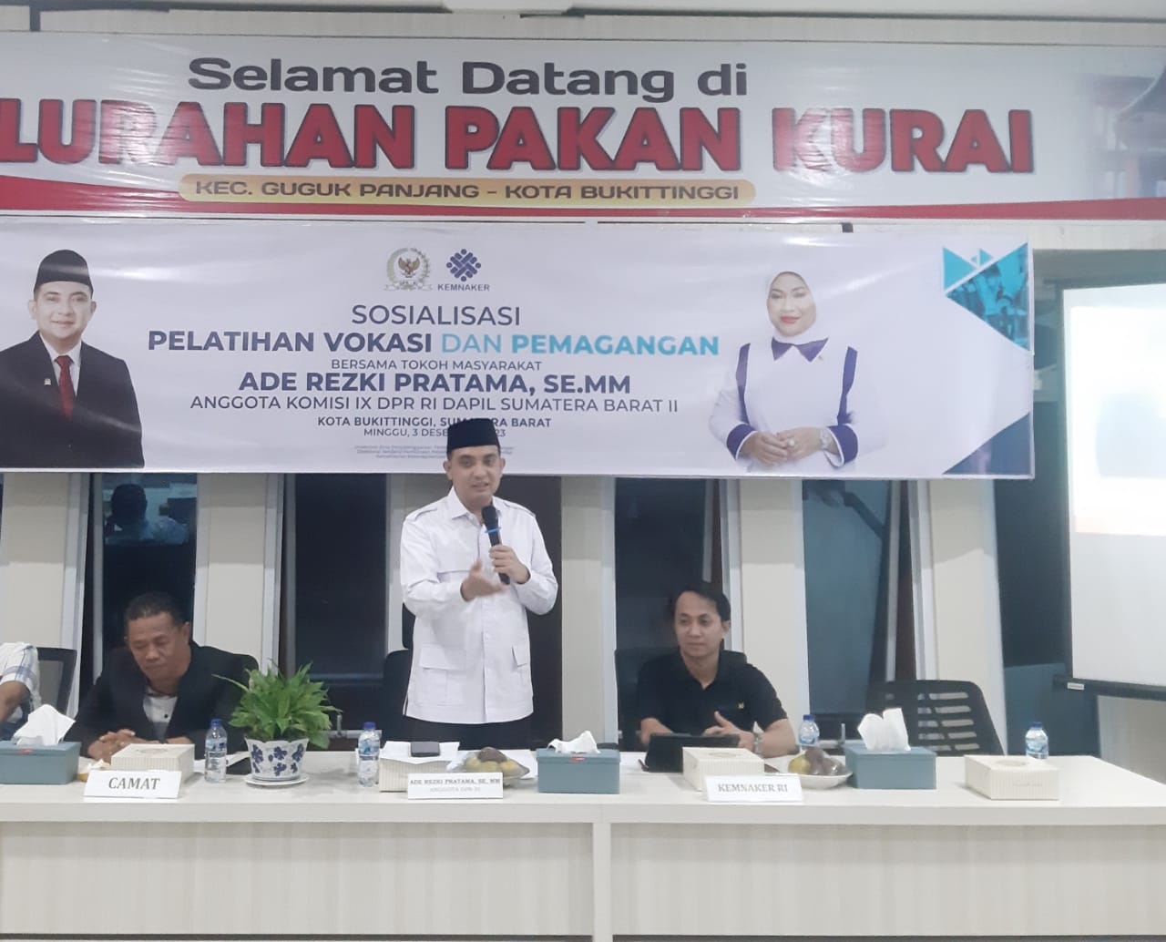 Bukittinggi,andalasrayanews| Dalam rangka menekan angka pengangguran di Kota Bukittinggi, Ade Rezki Pratama, SE.MM, Anggota DPR RI Komisi IX gandeng Kemnaker RI untuk melaksanakan kegiatan sosialisasi Pelatihan Vokasi dan Pemagangan. Kegiatan sosialisasi ini dilaksankan di aula kantor kelurahan Pakan Kurai, Kec. Guguak Panjang, Kota Bukittinggi, Minggu (3/12/2023).