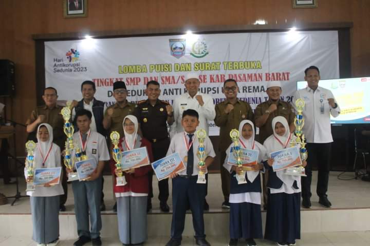 Dalam rangka peringatan Hari Anti Korupsi Sedunia Tahun 2023, Kejaksaan Negeri (Kejari) Pasaman Barat (Pasbar) mengadakan Lomba Puisi dan Surat Terbuka Tingkat SMP dan SMA/SMK se-Kabupaten Pasaman Barat serta Edukasi Anti Korupsi usia remaja dengan tema ‘Maju Membangun Negeri Tanpa Korupsi’, Selasa (12/12) di Aula Kantor Kejari setempat.