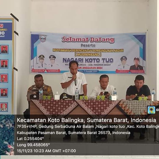 PJ Wali Nagari, Naspi,SE, membuka secara resmi Musyawarah Rencana Pembangunan ( Musrenbang) Nagari Koto Tuo Kecamatan Koto Balingka Pasaman Barat, bertempat di Gedung Pertemuan Nagari Koto Tuo, Air Balam, Rabu, 15/11/2023.