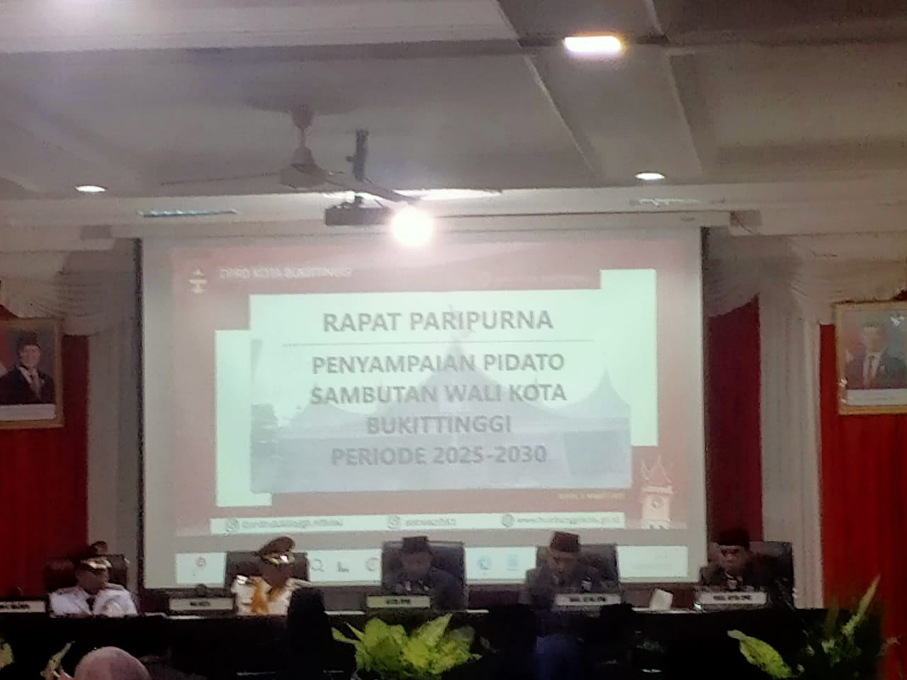 Bukittinggi | Rapat paripurna di kantor DPRD kota Bukittinggi menghadirkan Walikota dan Wakil Walikota terpilih periode 2025-2030, Senin (3/2). Penyampaian ini pidato di hadiri anggota DPRD, Forkopimda, pimpinan BUMN/D, Rektor perguruan tinggi yang ada di Bukittinggi, serta unsur niniak-mamak dan bundo kanduang.