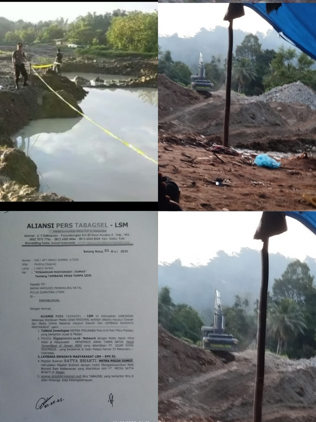 Melihat Kondisi Rusaknya Lingkungan Hidup dan Air Sungai Batang natal telah tercemar akibat Pengkerukan di Daerah Aliran Sungai Batang Natal dengan Alat Berat/Excavator Merek ZOOMLION diduga rentalan “M” di Lubuk Panjang Hilir Jembatan Gantung Dusun Rantobi, Desa Rantobi, Kec. Batang Natal, Sumatera Utara. Maka kami Aliansi PERS Tabagsel berkolaborasi dengan LSM melaporkan “M” ke Kapolsek Batang Natal tanggal 8 Mei 2025, namun karena tidak ditanggapi, kemudian membuat DUMAS ke Kapolres Mandailing Natal Tertanggal 22 Mei 2025 dengan Nomor Surat : 045/APT-Masy/DUMAS/V/2025, terang Maruba Hasibuan ( LSM KPK), didampingi rekannya U. Nauli H, SH.(Satya Bhakti) dan N.Siregar (Mitra Poldasu) di Mapolres Mandailing Natal kamis (29/5/2025).
