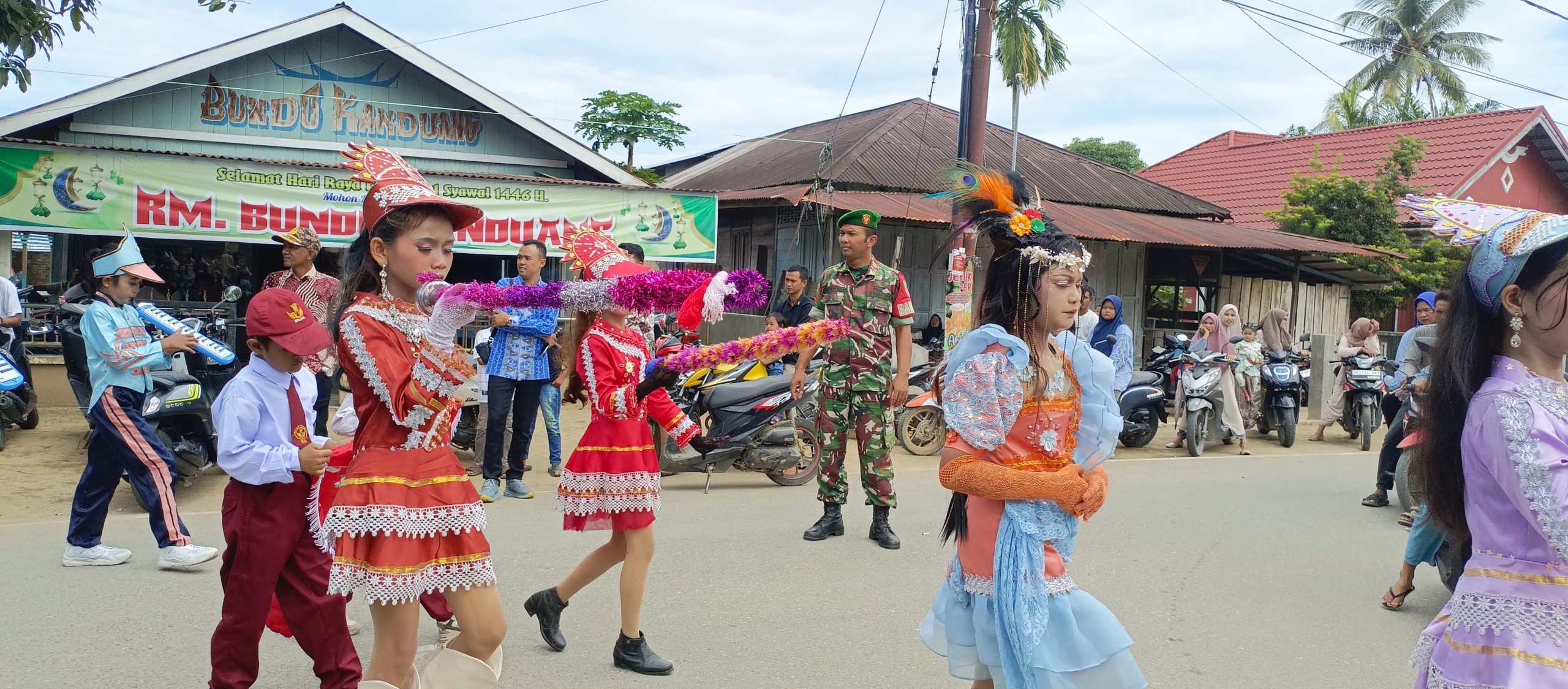 Selama diperjalanan seluruh peserta terlihat rapi selain itu juga terlihat disetiap persimpangan rute Pawai para anggota TNI dari Koramil 20 Batahan turut aktif dalam menertibkan jalannya para peserta Pawai.