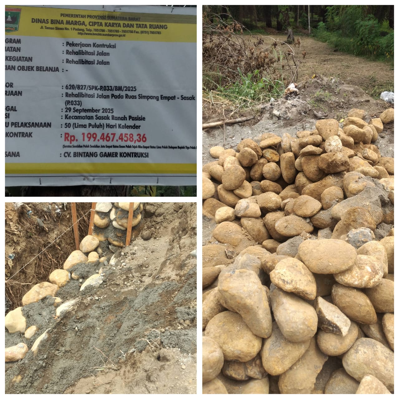PasBar,|| Pekerjaan jalan rehabilitas pada ruas simpang empat sasak terlihat sangat buruk sekali. Dari pemakaian material batu yang terlihat kotor, dan berlumpur, hinga pemasangan beton penahan badan jalannya yang di duga koverannya tidak sesuai sopek, alias pasangan pensil.