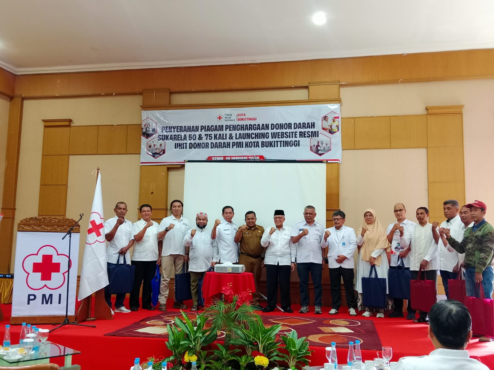 ARN, Bukittinggi– PMI Kota Bukittinggi memberikan apresiasi dan piagam penghargaan kepada 66 orang pendonor ke-50 dan 22 orang lainnya meraih penghargaan donor ke-75. Kegiatan yang dilangsungkan di aula Royal Denai Hotel ini berjalan meriah pada Senin, (19/1) yang dihadiri juga oleh Kepala Dinas Kesehatan Bukittinggi.