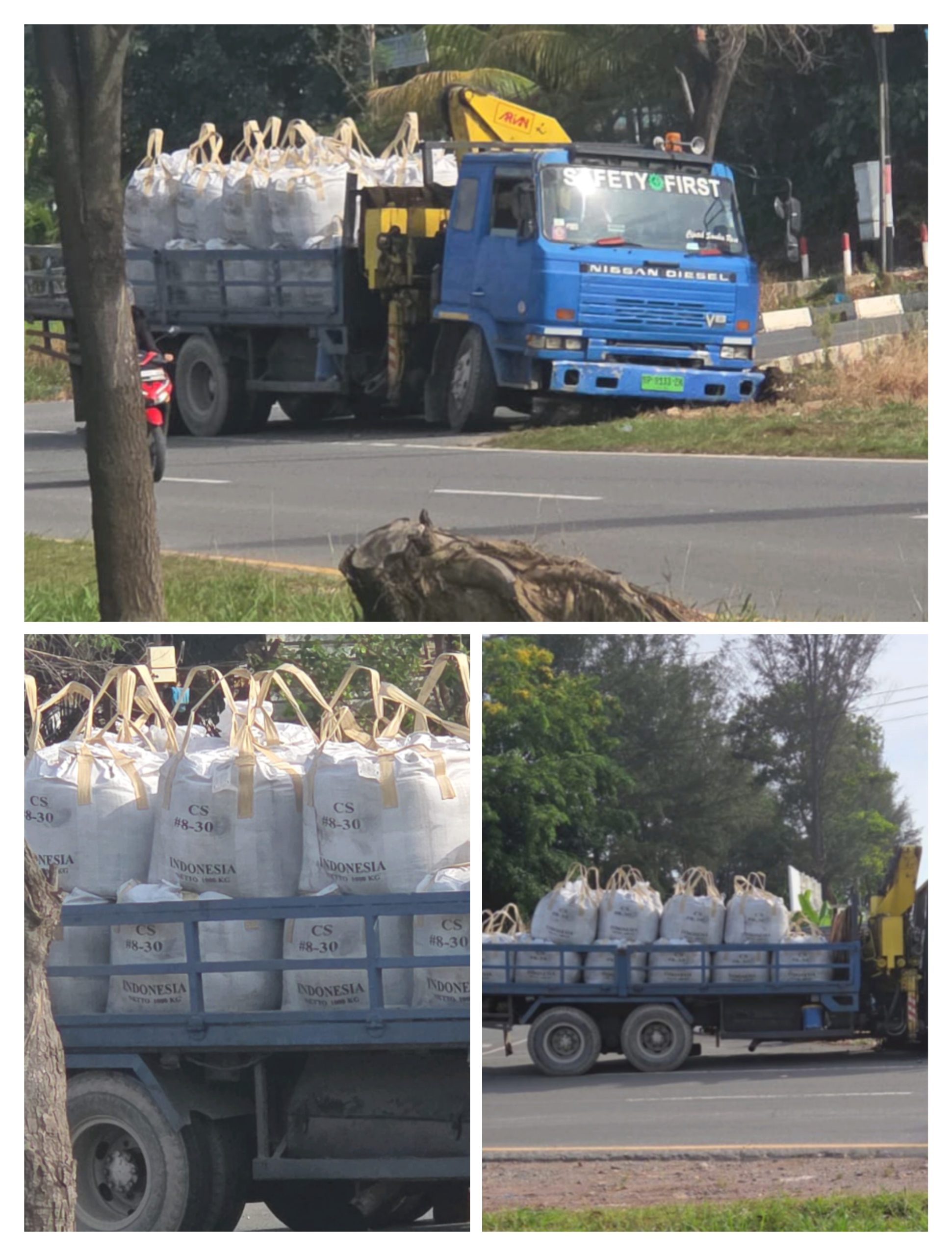 Berdasarkan pantauan di lapangan, sebuah truk crane jenis Nissan Diesel yang diperkirakan produksi sekitar tahun 1991 tipe CD 450VC/tronton terlihat mengangkut sejumlah karung berisi material yang diduga pasir sandblast. Kendaraan tersebut membawa muatan dalam jumlah besar menuju kawasan galangan kapal, Jumat (10/4/2026).
